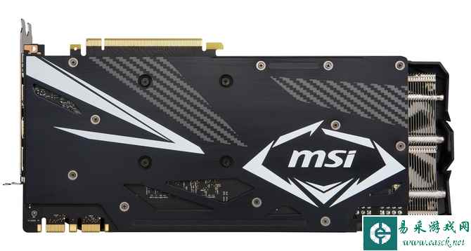 显卡背面,硕大的MSI品牌英文印刷充值品牌信仰,黑化全尺寸金属背板为PCB带来全面的保护,还可以提供一定的辅助散热能力,并起到加固作用。