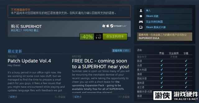 在疯狂周三中,这款在国区STEAM平台上价值78元的游戏进行6折的促销,现在只需要47元即可体验这款相当有趣的游戏。但比较可惜的是游戏虽然支持9国语言,但是并不提供中文的支持,但这类游戏一般没有复杂或详细的剧情让玩家了解,所以即使不支持中文也不会影响到玩家的游戏体验。