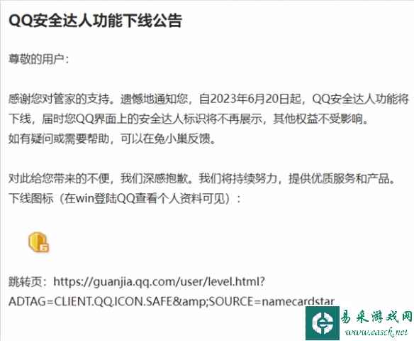 感谢您对管家的支持。遗憾地通知您,自2023年6月20日起,QQ安全达人功能将下线,届时您QQ界面上的安全达人标识将不再展示,其他权益不受影响。