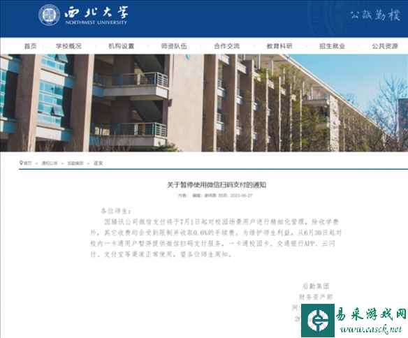 其中西北大学发布公告称:因腾讯公司微信支付将于7月1日起对校园场景用户进行精细化管理,除收学费外,其它收费均会受到限制并收取0.6%的手续费。为维护师生利益,从6月30日起对校内一卡通用户暂停提供微信扫码支付服务,一卡通校园卡、交通银行APP、云闪付、支付宝等渠道正常使用,望各位师生周知。
