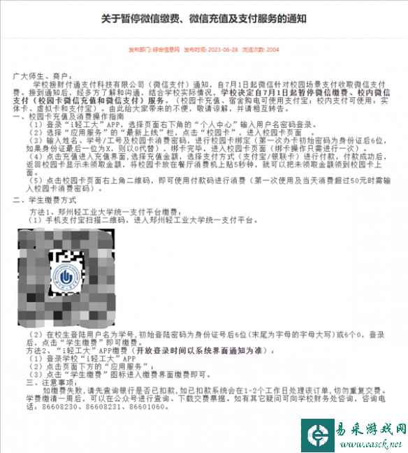郑州轻工业大学公告显示:学校接财付通支付科技有限公司(微信支付)通知,自7月1日起微信针对校园场景支付收取微信支付费。