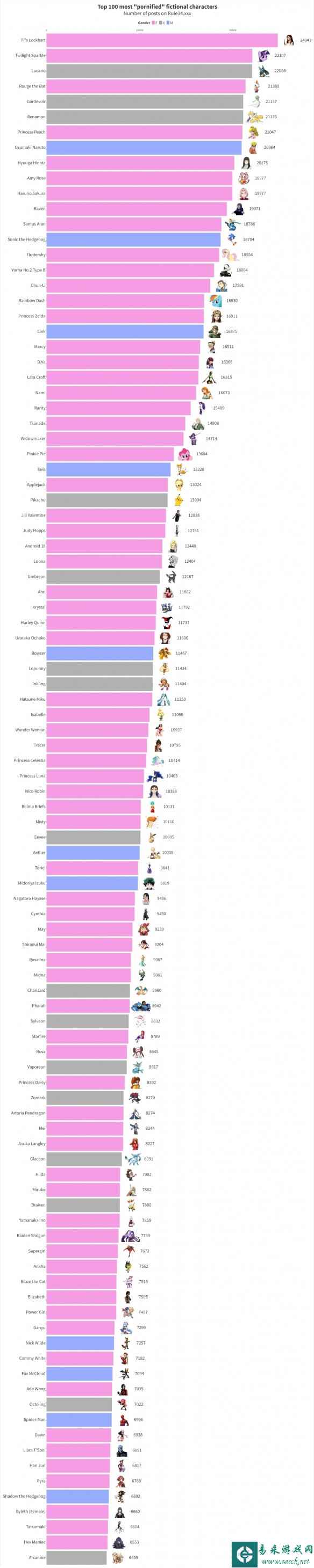 但画风到了角色排行榜这边就变得奇怪了起来。第一名是“耶路撒冷”《最终幻想7》的蒂法,实至名归没什么好说的。但从第二名的暮光闪闪(紫悦)到第六名的妖狐兽,中间竟然没有一个人类角色!甚至前十名里面人类角色不如非人类角色多!