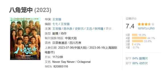 《八角笼中》累计票房17.61亿,总人次4312.7万,豆瓣评分7.4分。