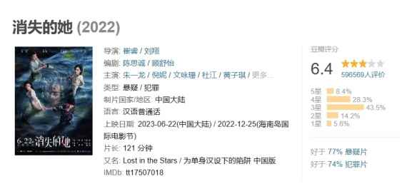 截至发稿前,《消失的她》累计票房34.48亿,总人次8296.9万人,豆瓣评分6.4分。