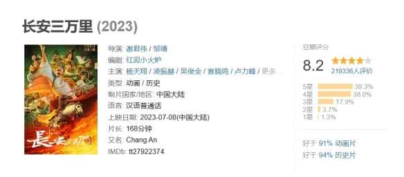 《长安三万里》累计票房10.13亿,总人次2444.4万,豆瓣评分8.2分。