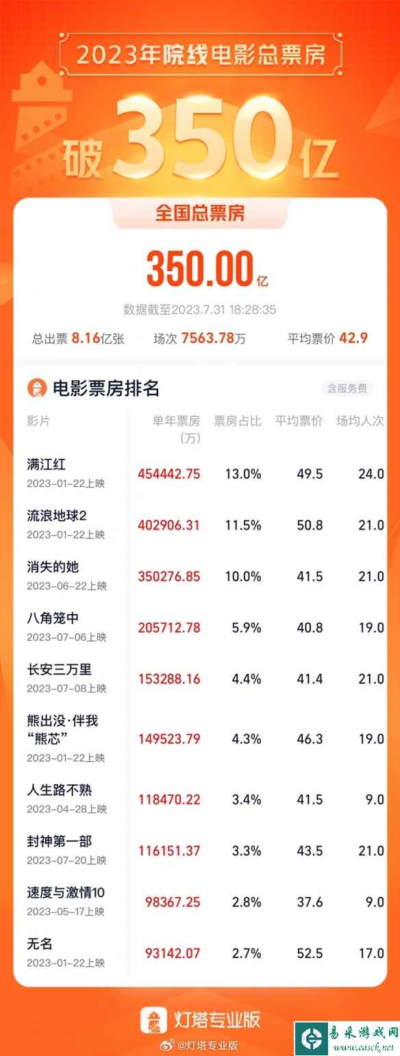 据灯塔专业版实时数据,截至7月31日,2023年度大盘票房(含预售)突破350亿,较2021年提前两个月。