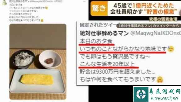 近日,一名45岁的日本男子的晚餐帖子引起了人们的关注。他在帖子中展示了自己的晚餐,只有简单的白饭和咸菜。这位男子声称自己拥有9300万日元(约人民币467万元)的存款,并且已经维持这样的生活方式超过20年。