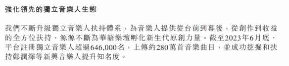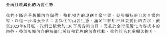 截至2023年上半年,网易云音乐的内容库包含1.36亿首音乐曲目,包括来自知名厂牌及原创音乐人的音乐。到2023年6月,平台原创音乐人数量超64.6万;共创作了约280万首音乐曲目。