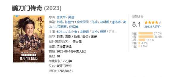 武侠喜剧《鹊刀门传奇》豆瓣升至8.1分!赵本山等主演