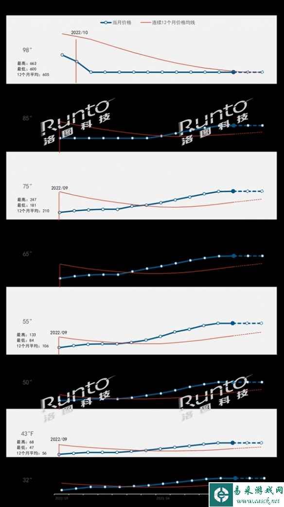 洛图科技(RUNTO)数据显示,面板价格自2月起至今单边上行了7个月,已经积累不少涨幅,处在相对高位。2022年9月到2023年9月,55英寸和65英寸电视面板价格涨幅高达60%。