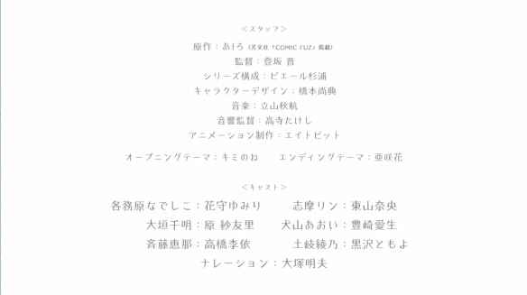 监督:登坂晋 系列构成:杉浦理史 角色设定:橋本尚典 音乐:立山秋航 音响监督:高寺たけし 动画制作:エイトビット