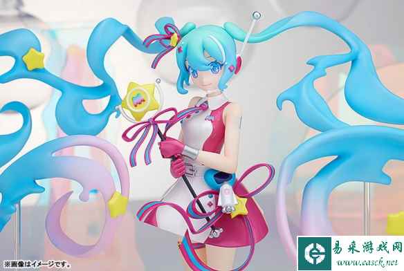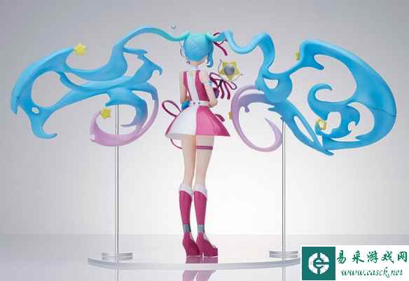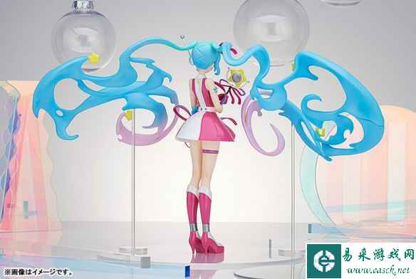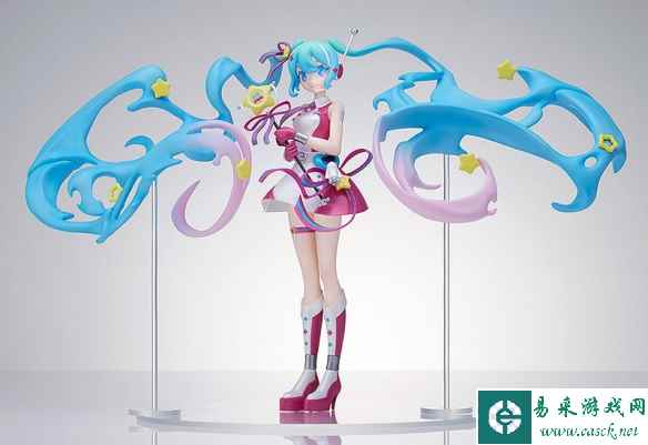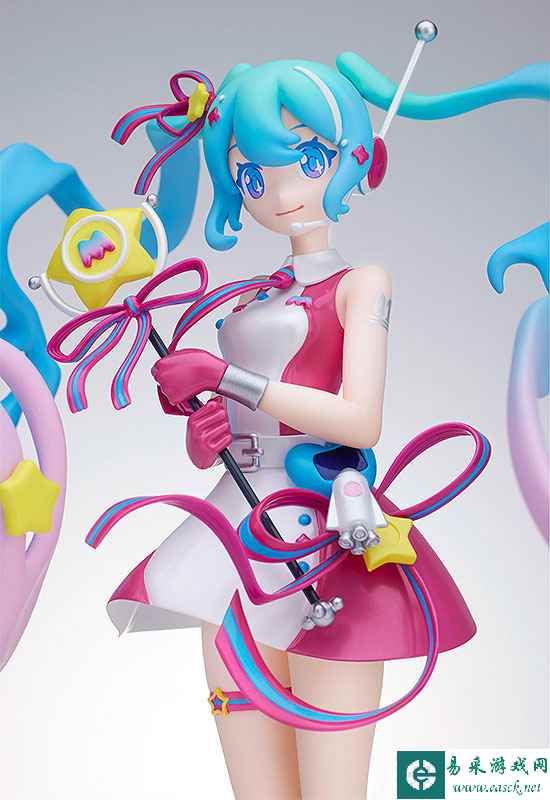 手办采用了魔法未来10周年主题曲《FUTURE EVE》的人设揍性进行立体化。可爱的miku一头标志的双马尾犹如颜料一般翻卷扩散,渐变色搭配上黄色的星星装饰与天线头饰展现出奇妙的未来梦幻感。粉色的无袖连衣裙一旁系着缎带与黄色星星装饰。双手拿着可爱的星星麦克风,裙摆之下一双袖长的腿穿着未来风格的长靴。
