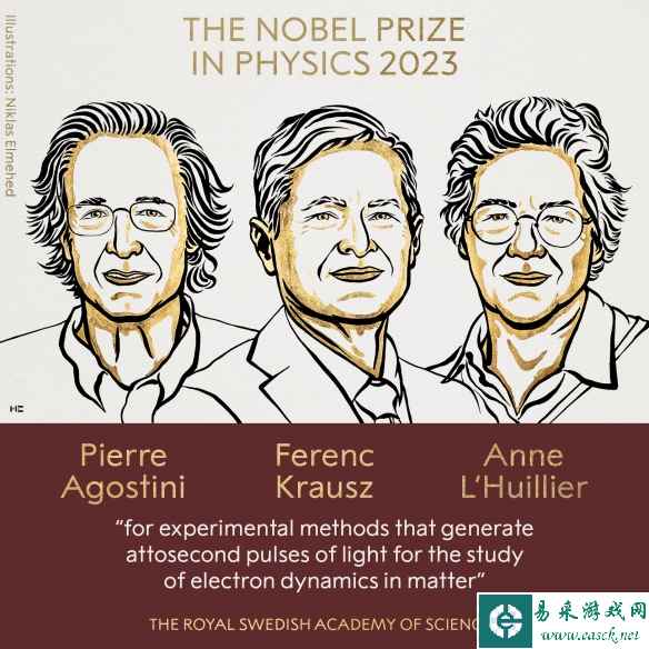 根据诺贝尔奖官方介绍,2023年诺贝尔物理学奖的获奖者有三位,分别是Pierre Agostini、Ferenc Krausz和Anne L’Huillier,官方表示授予他们奖项是为了表彰他们“为研究物质中的电子动力学,而产生阿秒激光的实验方法”方面所作出的贡献。