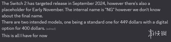 SoldierDelta还表示,任天堂目前确定的发布时间是2024年9月24日,这与之前有过的爆料是一致的,SoldierDelta还表示,如果9月不能如期发布,任天堂将会白11月3日作为PlanB。