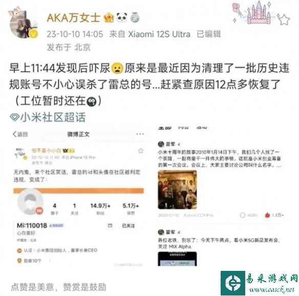 对此,小米社区负责人@AKA万女士发文确认,并称:“早上11:44发现后吓尿,原来是最近因为清理了一批历史违规账号不小心误杀了雷总的号......赶紧查原因12点多恢复了(工位暂时还在)。”