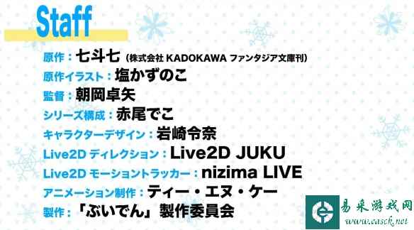 原作:七斗七(株式会社KADOKAWAファンタジア文庫刊) 原作イラスト:塩かずのこ 監督:朝岡卓矢 シリーズ構成:赤尾でこ キャラクターデザイン:岩崎令奈 Live2Dディレクション Live2DJUKU Live2Dモーショントラッカー nizimaLIVE アニメーション制作:ティー・エヌ・ケー 製作:「ぶいでん」製作委員会