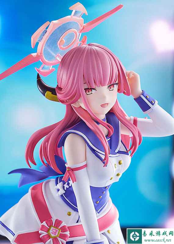 便利屋68永远的社长,陆八魔爱瑠以“恶作剧☆前线”的偶像造型进行立体化。一头粉色长发的社长头上光环存在感十足,脑后有着黑色尖角。一双锐利的眼睛搭配上撩拨头发的动作展露出与往日不同的气氛。蓝白水手服风格的偶像装,裙摆外环绕着粉色饰带。一双修长白皙的长腿也进行了纹理塑造。