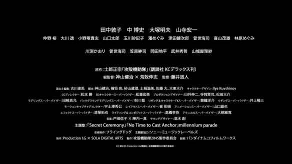 原作:士郎正宗「攻殻機動隊」(講談社 KCデラックス刊) 総監督:神山健治 × 荒牧伸志 監督:藤井道人 主題歌:「Secret Ceremony」「No Time to Cast Anchor」millennium parade 制作:Production I.G × SOLA DIGITAL ARTS 製作:攻殻機動隊2045製作委員会