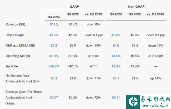 英特尔当地时间10月26日公布了2023财年第三财季报告,第三财季营收142亿美元(当前约1039.44亿元人民币),同比下降8%,市场预期135.4亿美元。