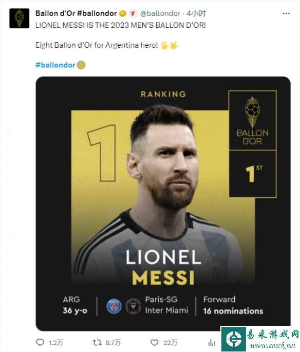 北京时间今天(10月31日)凌晨,2023年的金球奖颁奖典礼在法国巴黎举行,阿根廷足球巨星里奥-梅西获得职业生涯第八座金球奖,有关梅西获奖的讨论登上了推特全球趋势第一名。