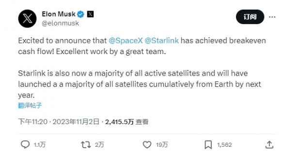 值得一提的是,SpaceX公司CEO马斯克上周也表示,SpaceX的Starlink业务已经实现现金流收支平衡。而他去年则表示“Starlink仍在亏损”,他对该公司最大的目标是“不破产”。这一消息对于SpaceX来说,堪称是一个里程碑式的进步。