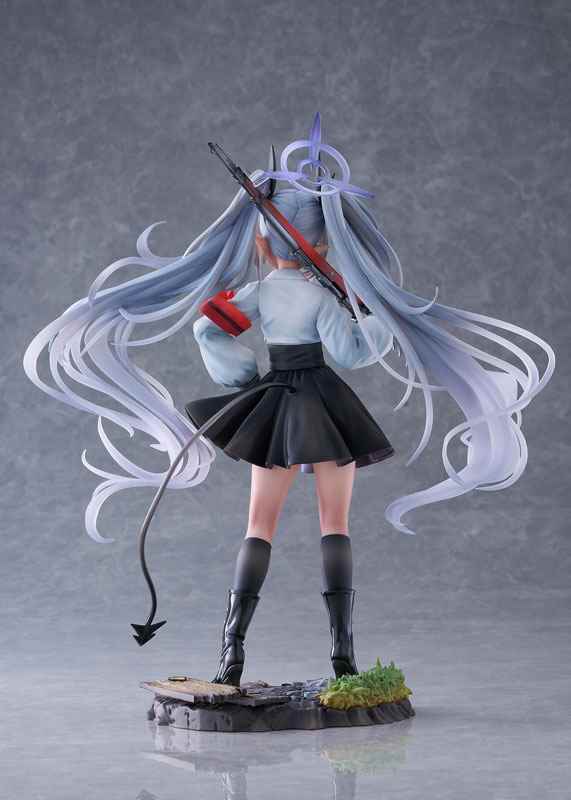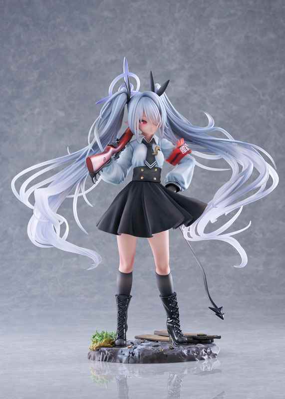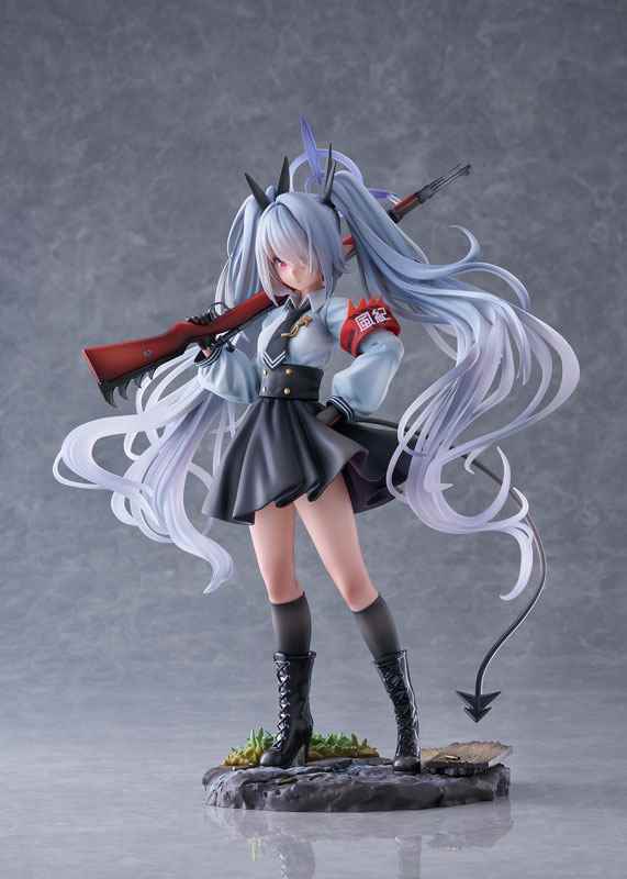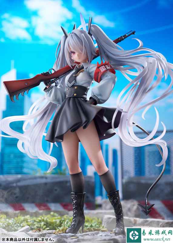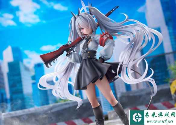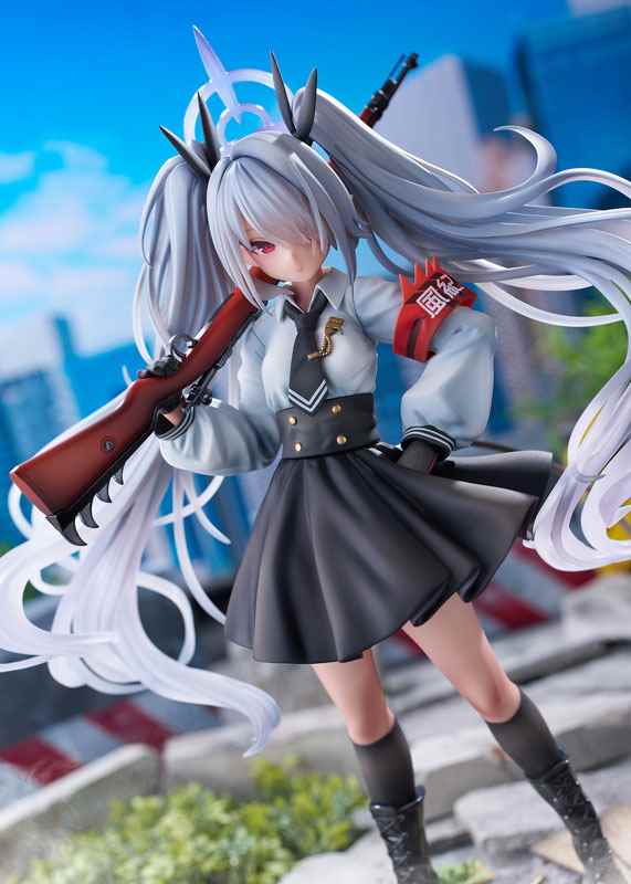 格黑娜学园所属,风纪委员会冷酷的专家,银镜伊织采用了游戏中的默认人设造型进行立体化。银色的巨大双马尾搭配上黑色尖角发饰。半遮的刘海下露出红色的眼眸。白色的学园制服搭配上黑色领带,肩膀带着风纪委员的袖标。下身的黑色裙摆下一双长腿穿着高跟长靴紧趁利落。背后的小尾巴,狙击步枪“百发百中”扛在肩头,十分帅气。