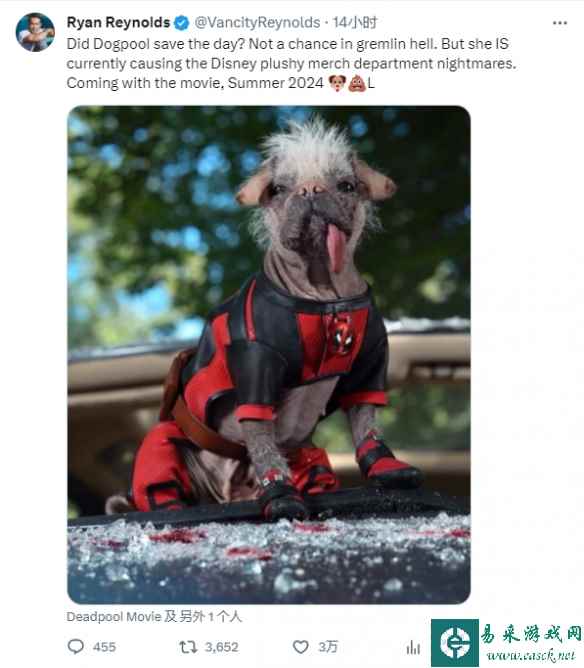 “小贱贱”瑞恩·雷诺兹在X(原推特)上隆重介绍了“死侍狗(Dogpool)”,并表示它将在《死侍3》中亮相。
