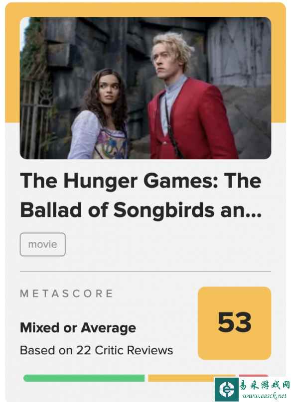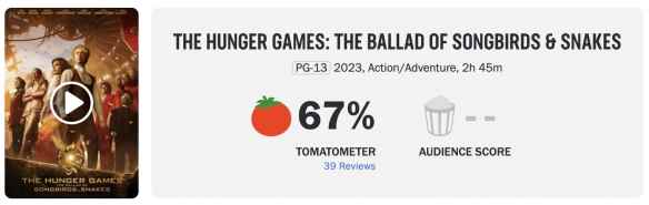 《饥饿游戏》前传电影《饥饿游戏:鸣鸟与蛇之歌》口碑解禁,目前烂番茄新鲜度67%,MTC评分53分。该片将于11月17日在中国内地上映。