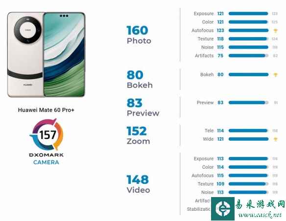 根据得分数据,Mate 60 Pro+拍照160分,排名第1;视频148分,排名第38;变焦152分,排名第4。