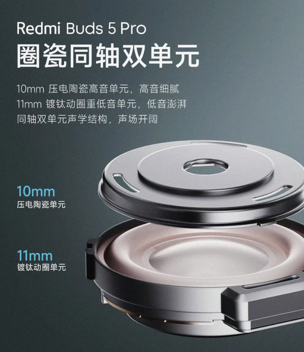 @Redmi 红米手机 今天下午发文对耳机新品 Redmi Buds 5 Pro 进行预热,喊出“Redmi 耳机史上最强音质”的口号。据介绍,这款耳机采用了圈瓷同轴双单元设计,由 10mm 压电陶瓷高音单元、11mm 镀钛动圈重低音单元组成,这套同轴双单元声学结构可带来细腻的高音和澎湃的低音。