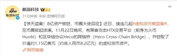 11月22日晚间,有黑客攻击HTX交易平台(前身为火币Huobi)和区块链协议Heco的跨链桥(Heco Cross-Chain Bridge),并窃取了价值约1.15亿美元(约合人民币8.2亿元)的虚拟货币资产。
