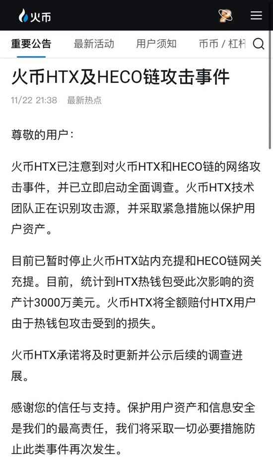 美东时间11月22日晚,孙宇晨在X上回应,“HTX和Heco的跨链桥(Heco Cross-Chain Bridge)遭到黑客攻击。HTX将全额补偿HTX的热钱包损失。暂时停止充值和提现。所有在HTX的资金都是安全的,社区可以放心。我们正在调查黑客攻击的具体原因。一旦我们完成调查并确定原因,我们将恢复服务。”