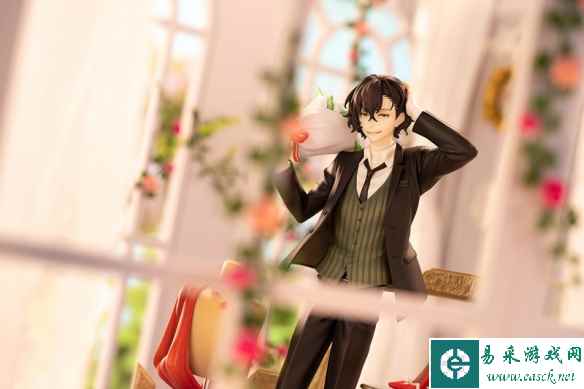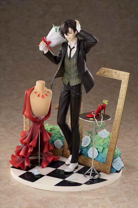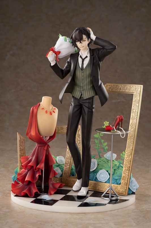 手办采用了游戏中太宰治的正装造型进行立体化。太宰治一头黑色的短发,脸上展露着开朗的笑容。帅气的黑色西装搭配上领带马甲白衬衫,一条笔直的黑色西裤勾勒出青年的修长身形。手中拿着的美丽花束上白色蔷薇的细节也同样没有落下。豪华版的底座采用了插画中的造型进行打造。模特的躯干与挂着的红色礼裙,一旁的桌子之上还有着一双红色高跟鞋,搭配上背后的金色画框也十分神秘。