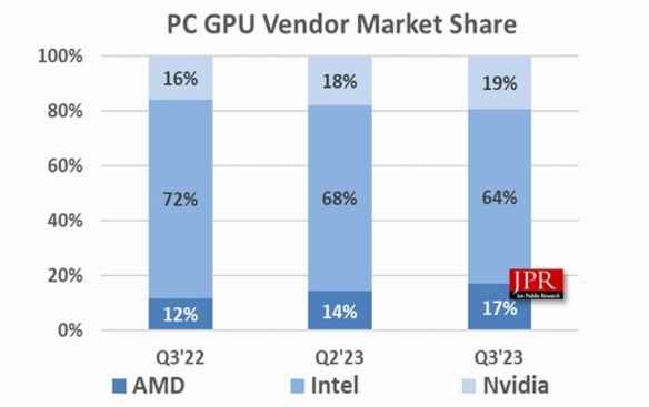 根据报道,有机构统计了最新的数据,GPU出货量在2023年第三季度迎来了新的增长,增幅达到16.8%,出货量也增至7190万颗。
