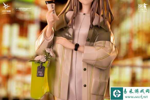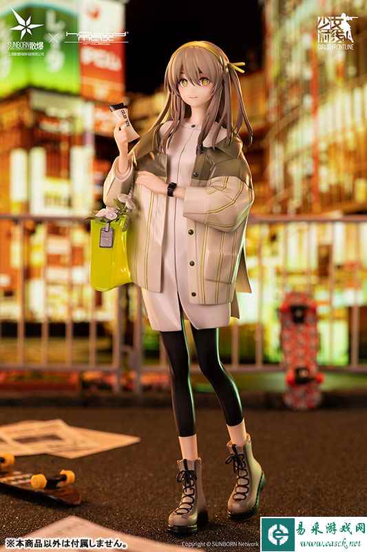 手办采用了2022年“酒杯人生”主题装扮系列中UMP40的“水中望月”游戏皮肤进行立体化。一头棕色的长发搭配上黄色发箍。黄绿色的外套搭配上白色上衣。黑色紧身裤搭配上靴子,手中挂着蓝绿色的挎包,有着与以往不同的日常风情。手中拿着两张票的少女似乎正在邀请玩家。