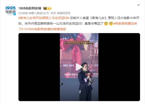据报道,《家有儿女》大电影《家有儿女之神犬当家》定档1月20日上映,在首映礼现场,总制片人官宣《家有儿女》原班人马的大电影也将在今年开拍,宋丹丹高亚麟杨紫张一山尤浩然全员回归!
