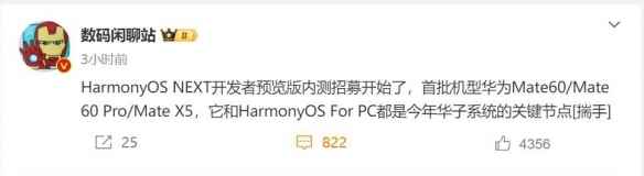 博主数码闲聊站表示,今年华为系统的重点是手机、平板和PC,除了HarmonyOS NEXT,还有HarmonyOS For PC,这两款系统都是今年华为系统的关键节点。