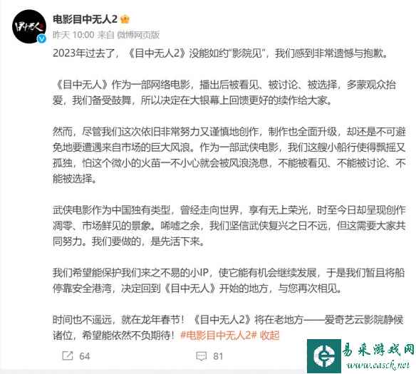 武侠动作电影《目中无人2》定档大年初一,片方原计划院线发行,不过为了扩大受众面,决定于今年2月10日大年初一同步上线爱奇艺云影院。