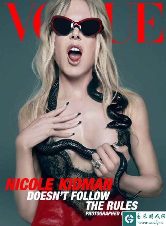 56岁的妮可·基德曼即将登上《Vogue》杂志澳大利亚版二月刊的封面,上身仅穿黑色蕾丝内衣,颈上还缠着一条大黑蛇,表情炫酷,画面极具冲力,一起来欣赏一下吧!