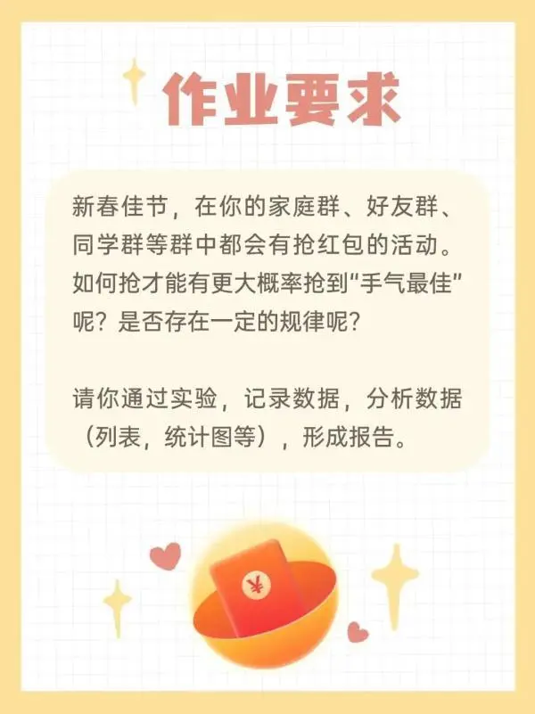 过年期间,微信群抢“红包”尤为频繁,很多人都希望成为手气最佳的那一位。据国内多家媒体报道,深圳中学龙岗学校数学科组的老师们借寒假作业,开展了别开生面的“抢红包”PBL项目式探究学习。