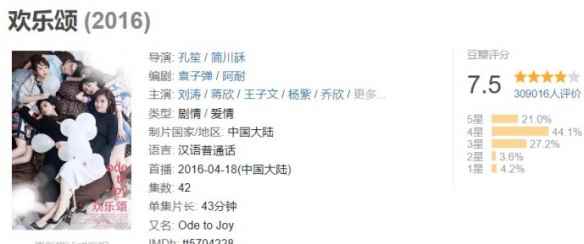 此前《欢乐颂》1到4部,分别在豆瓣评分为7.5分、5.4分、4.8分、5.7分。