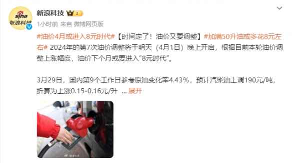 “8元时代”!油价4月1日迎来调整 加满50升多花8元