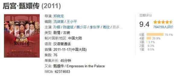 《甄嬛传》于2011年播出,由孙俪、陈建斌等人主演,豆瓣评分高达9.4分。