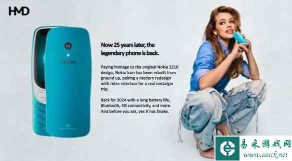 宣传谍照还透露了诺基亚3210(2024)将拥有长续航、蓝牙连接以及4G网络功能。据悉,该款手机预计将于5月上市。