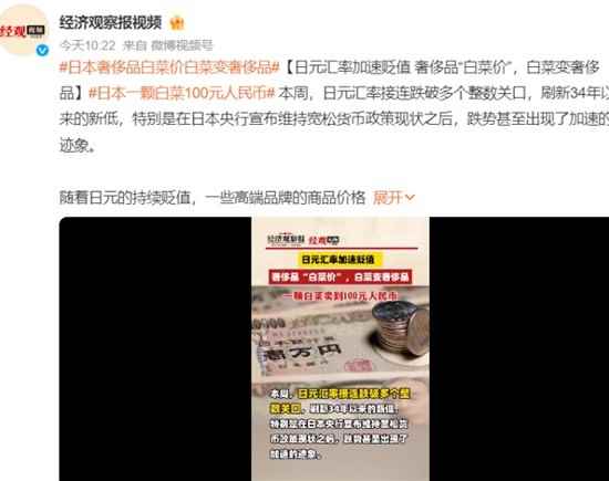 日本白菜价格飙升至100元人民币,日元汇率创34年新低