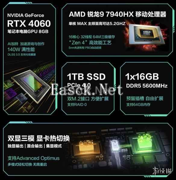 天选5 Pro锐龙版同样深受二次元玩家喜爱。其搭载AMD锐龙9 7940HX处理器,采用16核心32线程设计,单核MAX主频达5.2GHz,在满功耗GeForce RTX 4060笔记本电脑GPU加持下,轻松畅玩游戏大作,更支持PBO自动超频,进一步优化处理器性能;同样配备16英寸全能电竞屏,2.5K高分辨率165Hz高刷新率,支持100% sRGB色域覆盖,游戏画面更精彩;还有天选炫彩影刃键盘,为玩家游戏提供满满氛围感。