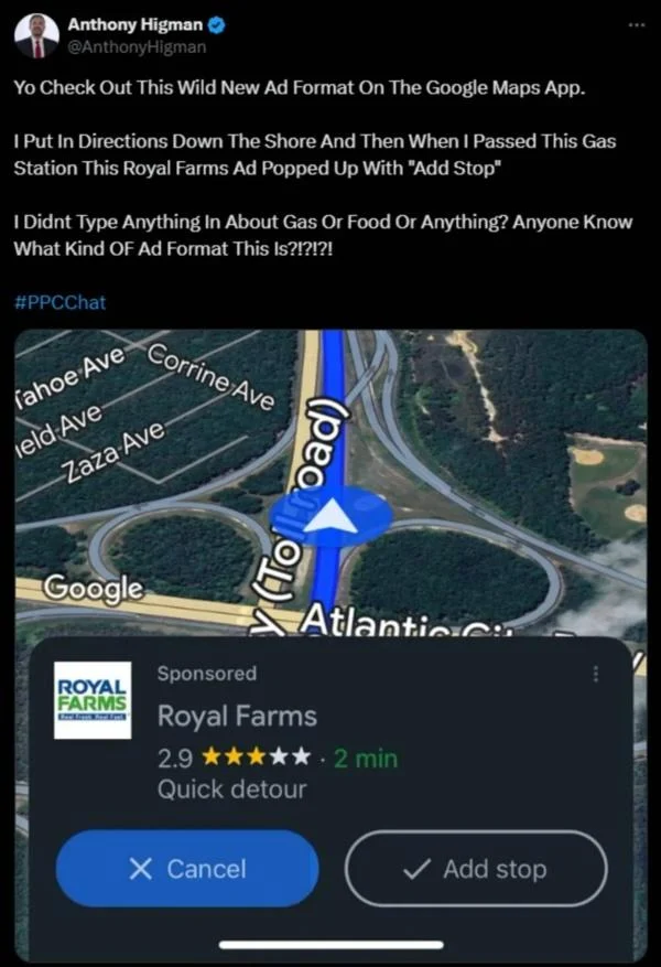 根据用户在社群媒体上的分享,当他在通勤途中使用谷歌地图导航时,突然弹出了一个覆盖屏幕下半部分的广告,推荐他经过一家Royal Farms加油站,尽管他并未搜索过此类地点。