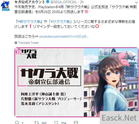 世嘉于今天(6月19日)宣布,旗下备受期待的《新樱花大战》将于6月26日将开新直播《樱花大战 帝剧宣传部通信》,届时将公布更多关于《新樱花大战》的详细情报,也将包括具体发售日期!