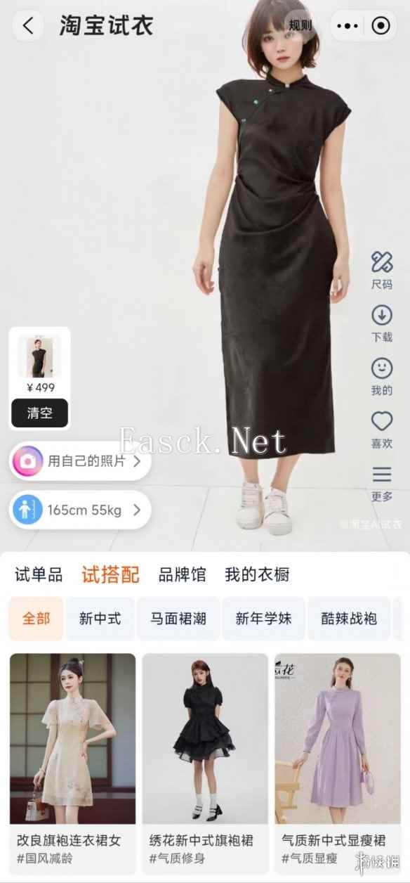除了生成虚拟形象外,使用者还能够一键选中店铺里的衣服进行试穿,提前看到衣服上身之后的效果,可以说是既方便又实用。