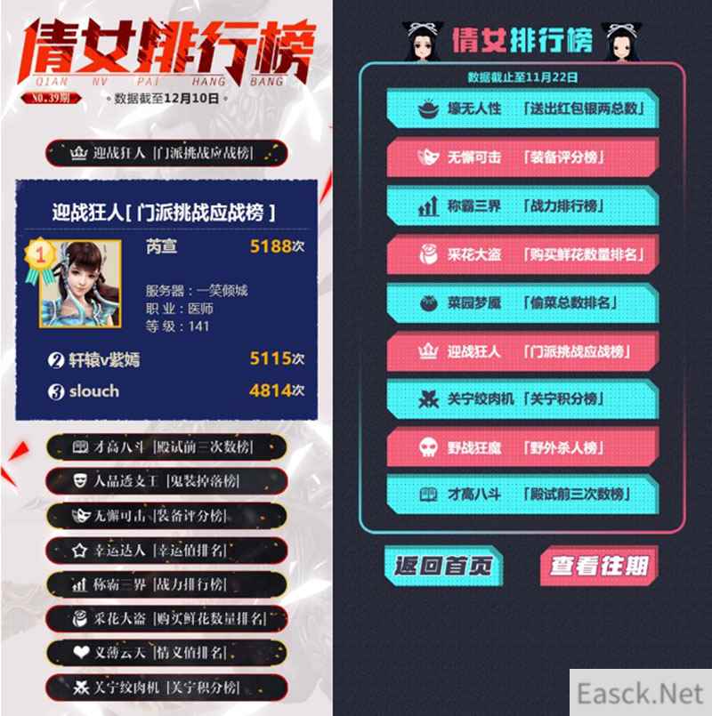本期迎战狂人榜上,来自一笑倾城的玩家【芮宣】以5188次拔得头筹。同时其他榜单的争夺也是热度不减,称霸三界排行榜中【宛颜轩影】以1559588战力位居榜首,而第二名【QST丶ICE】以1526652的战力紧随其后,竞争可谓是十分激烈!其他更多精彩排行,详情尽在本期膜拜榜!